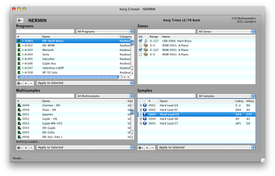 Full View This is a good general view of the Bank. You can select Programs and see the Oscillator/Zones that work within them. You can view the Multisamples, and view the Samples referenced by them. And you can assign Multisamples to Oscillator/Zones very easily, since the lists are fight next to each other. |