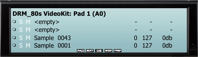 - LovVel, HiVel, and Volume from left to right. Vels are 0-127, Volume is -96db to +12db.