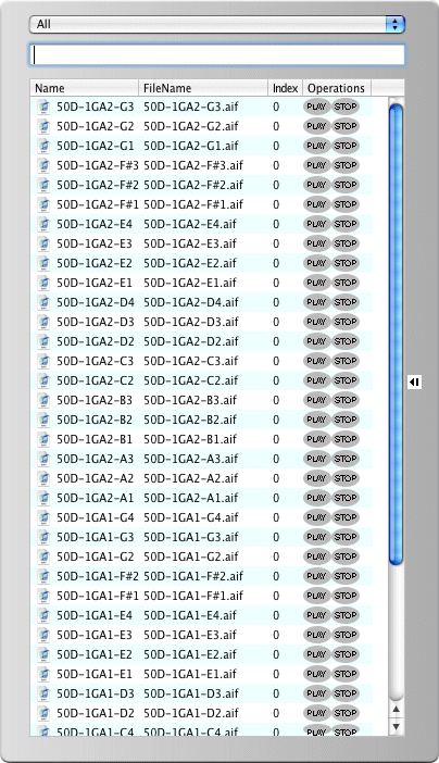 The Sound Database allows you to view items in your database, and drag items out of the window into the Pads on the Main Interface. The pulldown menu at the top allows you to choose the preset areas, or all the entries. The text area below allows you to include keywords in your filtering. The list has four columns:
