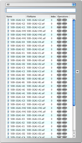 The powerful Sound Database lists all your entered samples in a list. It can contain WAVE or AIFF Samples of any bitrate, samplerate, or length. There is only one Database for you to use. In future versions there will be the ability to have multiple Databases. You can access the Database with the Sound Database Simple Interface, the Sound Database Editor, or via any Import context menu. Each Sample File can only have one listing. There are two main categories, Drum/Percussion and Chromatic. Most sounds fit into one or the other category. Chromatic are sounds that are pitched and rise in pitch up and down the "keyboard". Drums/Percussion are "non-pitched" sounds that usually play on one key. (For the purists out there, all sounds are "pitched" in one degree or another, but we are using the term in the sense of playing the sound in equal-tempered increments.) Each of these two categories have several fixed sub-categories. You can view one of these sub-categories, or you al choose look at ALL in a certian category. Or, there is an ALL listing where you can simply see all your samples without breaking them down. Each column gives you a certain amount of information: