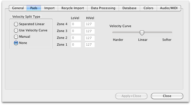 Enabled when "Use Velocity Curve" is selected under Vel Split Type. Moving the sliders changes the numbers within the LoVel-HiVel boxes.