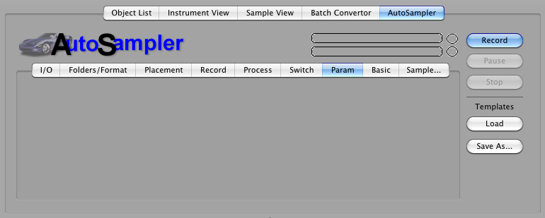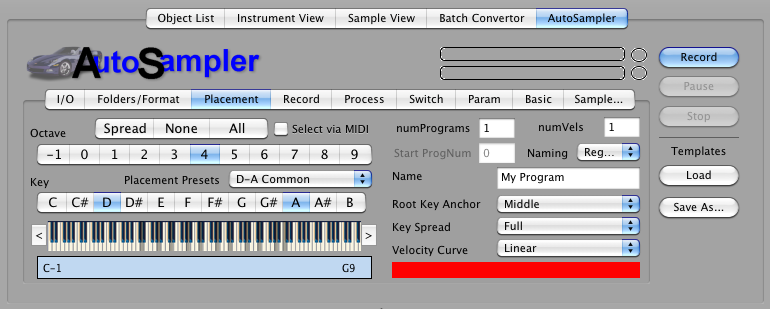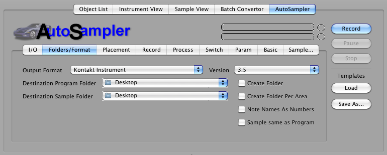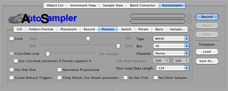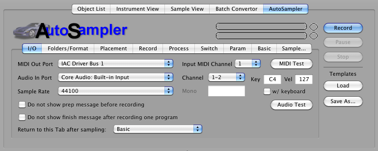 Processing Add Loop: This turns on the loop in the destination format. The slider sets the approximate loop start area you want to set. Note: This is approximate; if you choose to loop, the engine will make some decisions about the best place to loop BASED ON this parameter. CrossFade Loop: (Only available when AddLoop is checked.) This hardcodes a crossfade loop into the recorded sample. The slider determines the length of the crossfade; we recommend values around 4000 samples. Crossfade As Parameter If Available: Some samplers have a XFade parameter that crossfades a loop on the fly without having to hardcode the crossfade in the data. Checking this puts the crossfade lenth in this parameter and forgoes the hardcoding. Normalize: This boosts all samples up to 0db level at highest, with one twist: it takes the highest level in ALL the recorded samples, and normalizes all the samples regarding that level. This way, the balance of levels is preserved. This is highly recommended to be checked. Chop and Add Parameter Attack: Sometimes the data that is under a relatively slow attack is the same as the sustained portion. Checking this tells AutoSampler to truncate all data up to the highest level (before the loop start if there is one), calculate the time it took to get there, and writes the AmpEnv Attack parameter accordingly. Create Release Triggers: If checked, AutoSampler will make separate samples of when it releases the key, adn the output format will program and use these samples accordingly, plus set the release parameter to around 150-300ms. Note: if the output format does not support release triggers, AutoSampler will not create these samples, effectively ignoring this parameter. Do Not Trim: This diables the automatic trimming AutoSampler does post-recording. Again, this is often used in conjunction with the Allow Silence parameter, where you want the silence after the sound to use for your manual post-processing. No Silent Samples: If any samples created by AutoSampler are silent (no data equal above the threshold, they will not be written and not referenced by the output file. This can be handy when in MultiChannel mode and not all channels are active. Type: This is the type of sample file AutoSampler will write. If your output format uses WAVE, AIFF, or CAF files, and this parameter is chosen, this is what it will use. (AutoSampler does not recognize the usual Sample Type parameter in Format Preferences.) If you chose a Type that the destination doesn't support but supports one of the other ones, it will chose the one it supports. If your output format uses it's own sample type or stores it internally, this option makes no difference. Bits: This is the bitrate of the resulting sample. AutoSampler records in 32-bit floating point, which has more resolution than 24/16/8-bit, so any selection in those ranges will be dithered down. Most samplers only support 16-bit, and most software samplers support 24-bit, but almost none support 32-bit floating point. Hint: for "lo-fi" audio, a trick is to choose 8-bit here, than the recorded 32-bit will be dithered to 8-bit, then usually upgraded to 16-bit. This can give a lo-fi sound to the recording. Record Channels: This determines the output format of the samples. Commonly this is Stereo or Mono, but the other options put AutoSampler into MultiChannel mode. It will record stereo pairs for each incoming channel pair. Please only select one of these if your Input Audio supports that amount of channels.