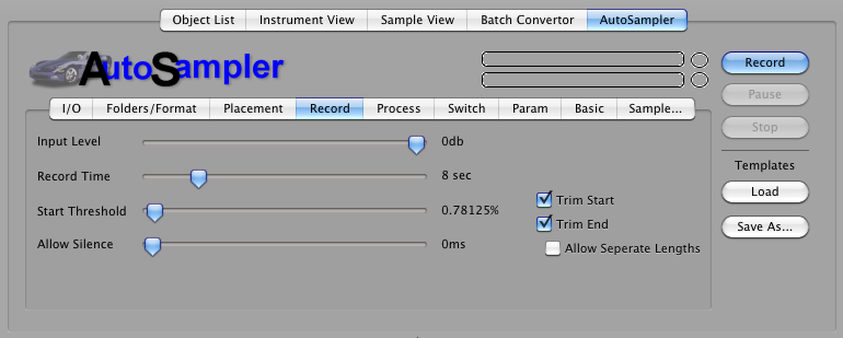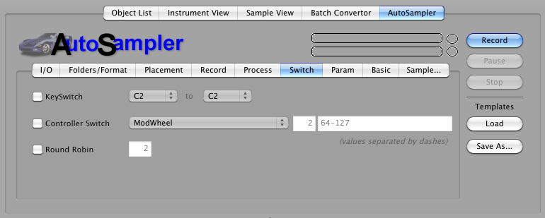 Once you have used Autosampler a couple times, you'll have some set note payouts and setups you'll want to save. You can do that in the Load/Save As... buttons to the right. Save As.. saves your current work, Load saves templates you've saved earlier. They are contained as .ast files in your Application Support folder: