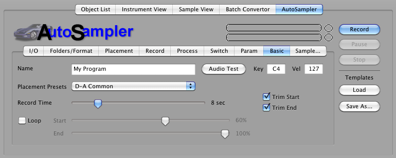 Basic Loop, Loop Start, Loop End, Program Name, Trim Start, Trim End, Placement Presets, Record Time, Channels, plus the Audio Test command button and parameters. |