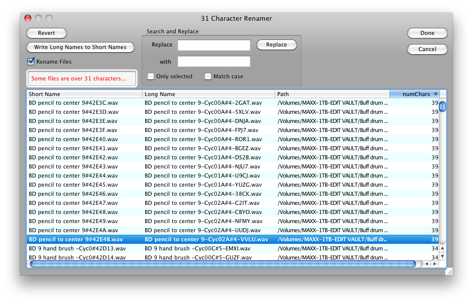 Translator™ will look through the file first and see if there are any >31 names. If there are, it brings up a dialog with all the names. You can manually change the long names (or use the Search-Replace thing), and the dialog informs you continually of the >31 name status. The last column tells you the length of the long name.