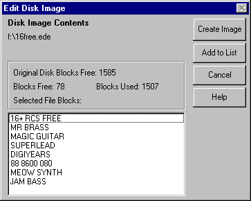 This allows you to create a New Disk Image, or edit a Disk Image with the selected File Images contained within. Create Disk Image starts a new Disk Image, while Edit Disk Image shows the current state of the Disk Image. Create Disk Image within the File List Box starts a new Disk Image with that File Image contained automatically.