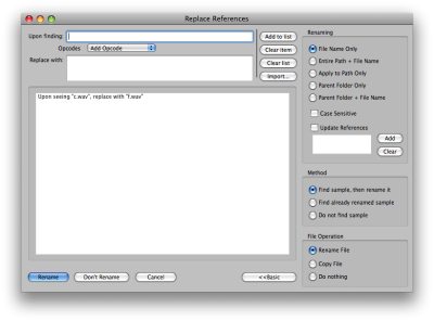 We added an entry “Upon finding c.wav, replace with f.wav”, and under method we would choose Do Not Find Sample. That would rename the references. Then we would do a Fix References to point them to the different location. Very handy!