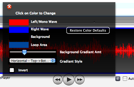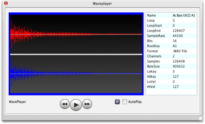 The Sample View displays a waveform and allows playback, including the proper looping that may be programmed into the sound. The waveform appears by selecting a sample in the Object List. There is an information box that lists all the pertinent information concerning the sample (regardless where it comes from) on the right. Loop areas (defined by the numLoops, Loop Start, and Loop End parameters) and Playback areas (defined by the Start and End parameters) are are displayed using box outlines on the screen. The regular set of transport controls is shown below the waveform screen. A checkbox called AutoPlay allows the player to play back a sample when it is selected. You can also unconditionally turn off loop playback by selecting the No Loop checkbox. The e button shows you the properties of the Sample View. You can choose the color of each facet of the view, plus the gradient of the background. This screen can be detached from the main window by clicking the Detach button above the right-pane. See Docking Dialogs for more information. A special note concerning SampleView docking: Since it is usually located at the bottom of the Main Screen, you need to select it in the right-pane, which moves it up to the right-pane. Then you detach it; thus it is invisible in TWO places on the Main Screen. Reattaching it puts it back to the right-pane, where when you click off of it, it puts it back to the bottom of the Main Screen. |